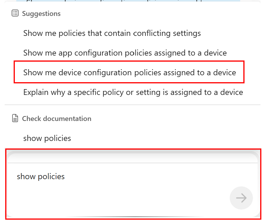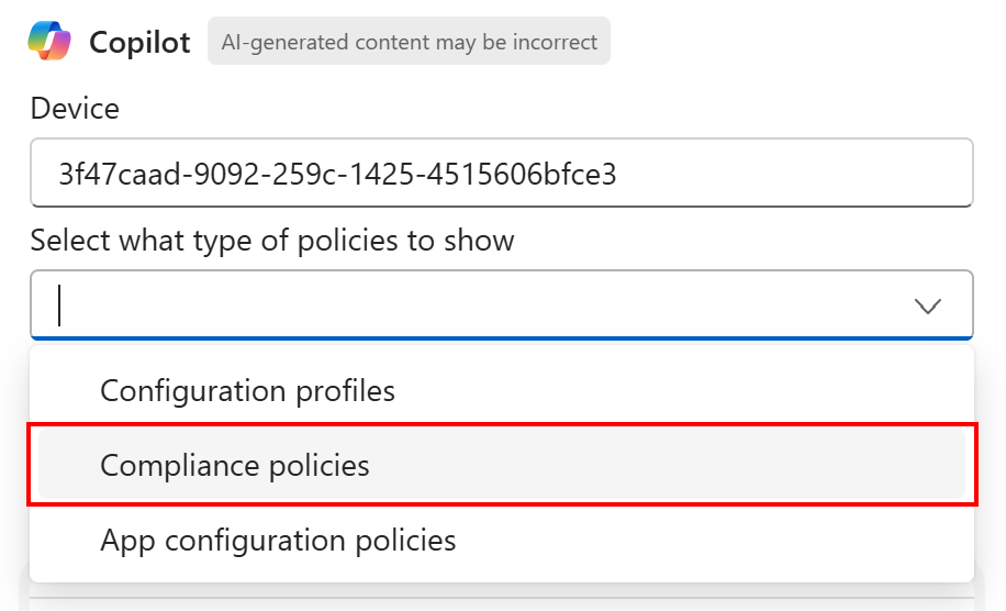 在管理中心,點到 「所有>裝置 」並選擇任何裝置。 在你的 Copilot Chat 會話中,輸入show policies並選擇指定給裝置提示的「顯示裝置設定政策」。