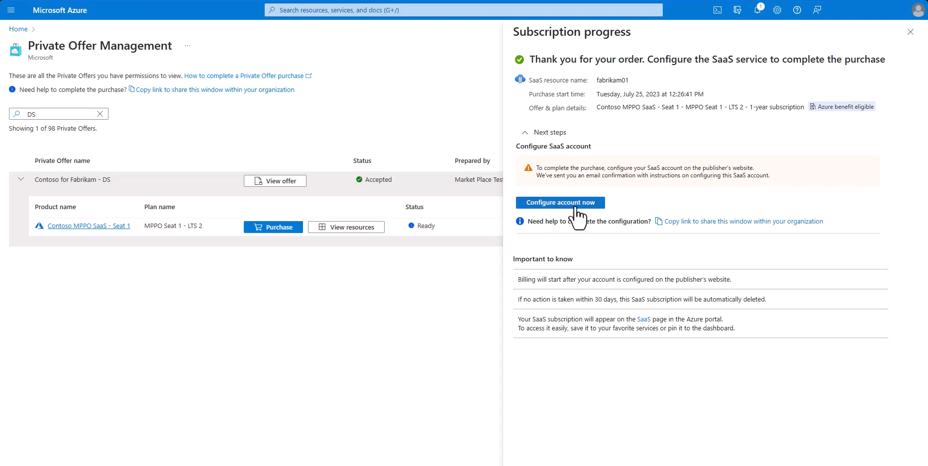 按鈕啟用之後,Lorenzo 會選取它並完成 SaaS 啟用。 購買已完成。 Lorenzo 在 Marketplace 中成功為 Adatum Corporation 採購了該軟件。