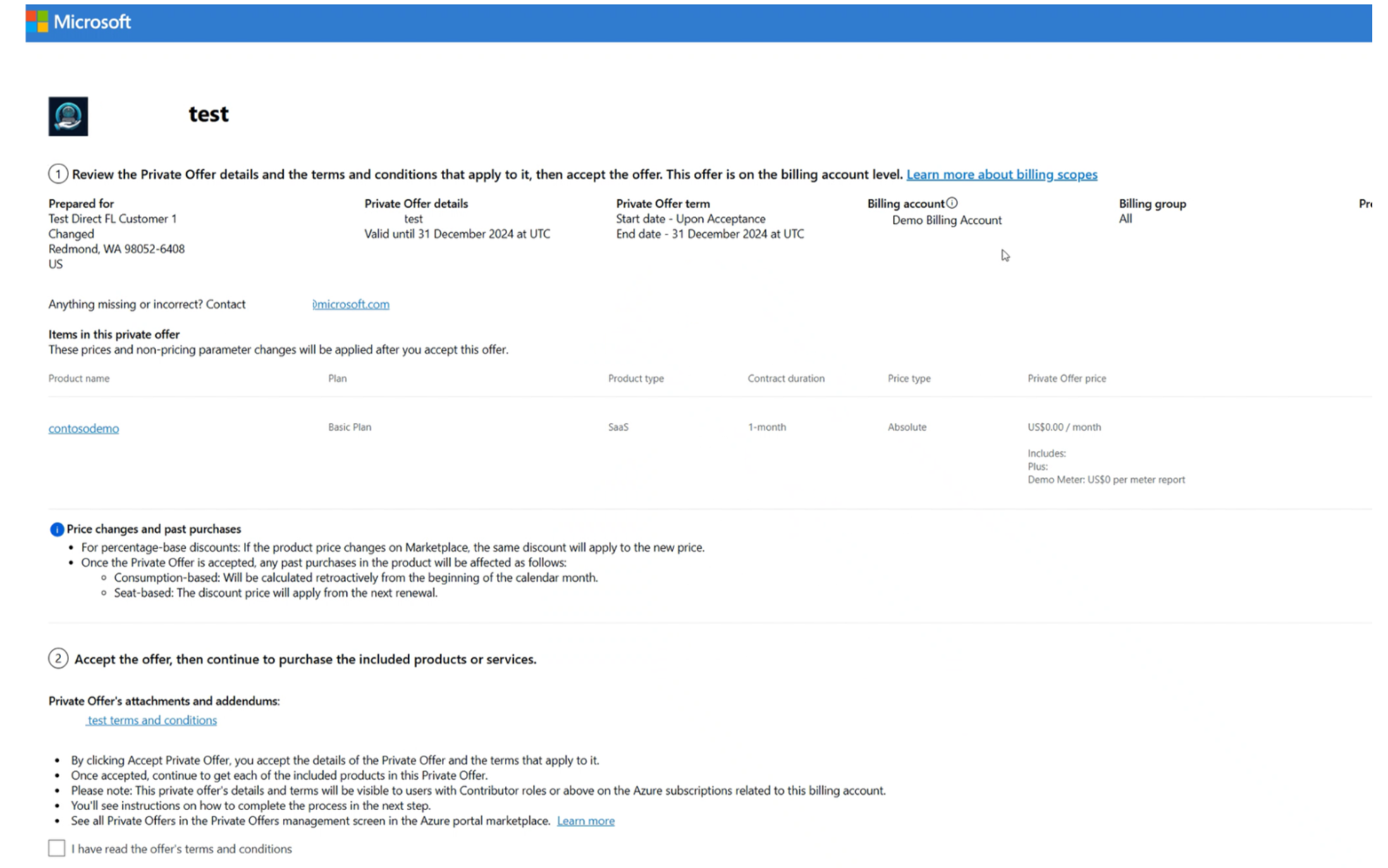 當您接受私人供應專案時,貴組織同意供應專案中列出的條款和價格,這會建立貴組織與Microsoft合作夥伴之間的系結合約。 此步驟要求您完成所有必要的預先檢查,擁有必要的許可權,以及有效的計費帳戶 ID。