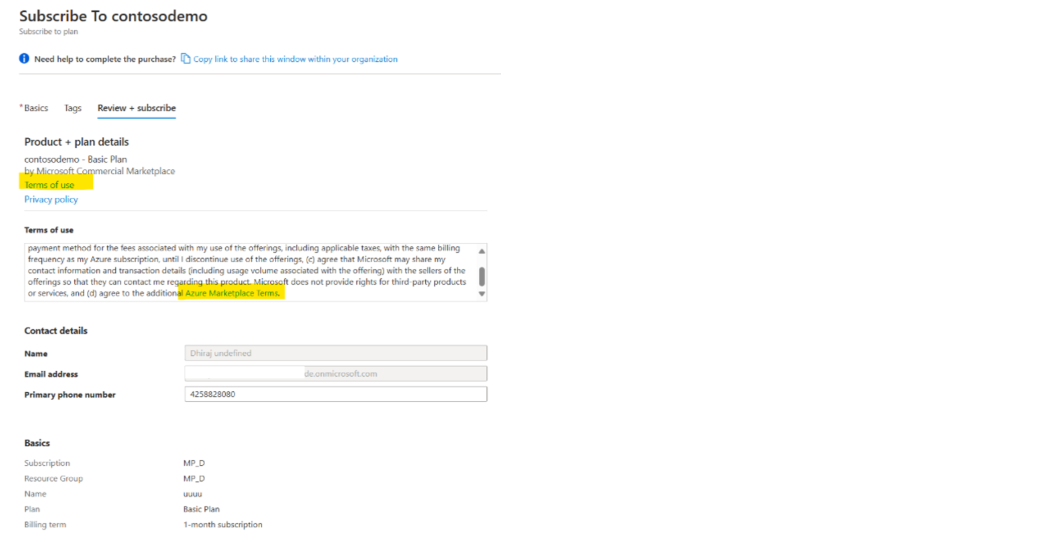 b. 訂閱私人優惠時會顯示條款。 按兩下 [使用規定 ] 以下載自訂條款。 此外, Microsoft Marketplace 條款 也可供檢閱。