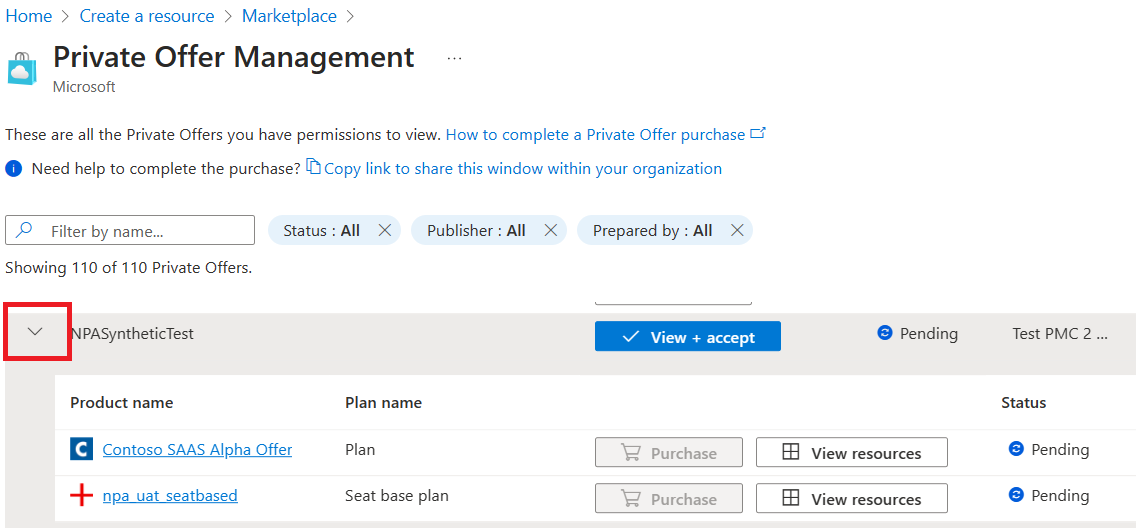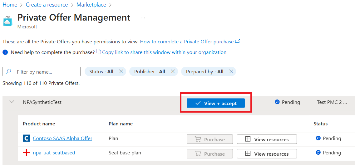 您也可以在 Azure 入口網站 內存取 Marketplace,並流覽至 [私人供應專案管理] 儀錶板。 您可以在那裡找到檢視 並接受 優惠的連結。
