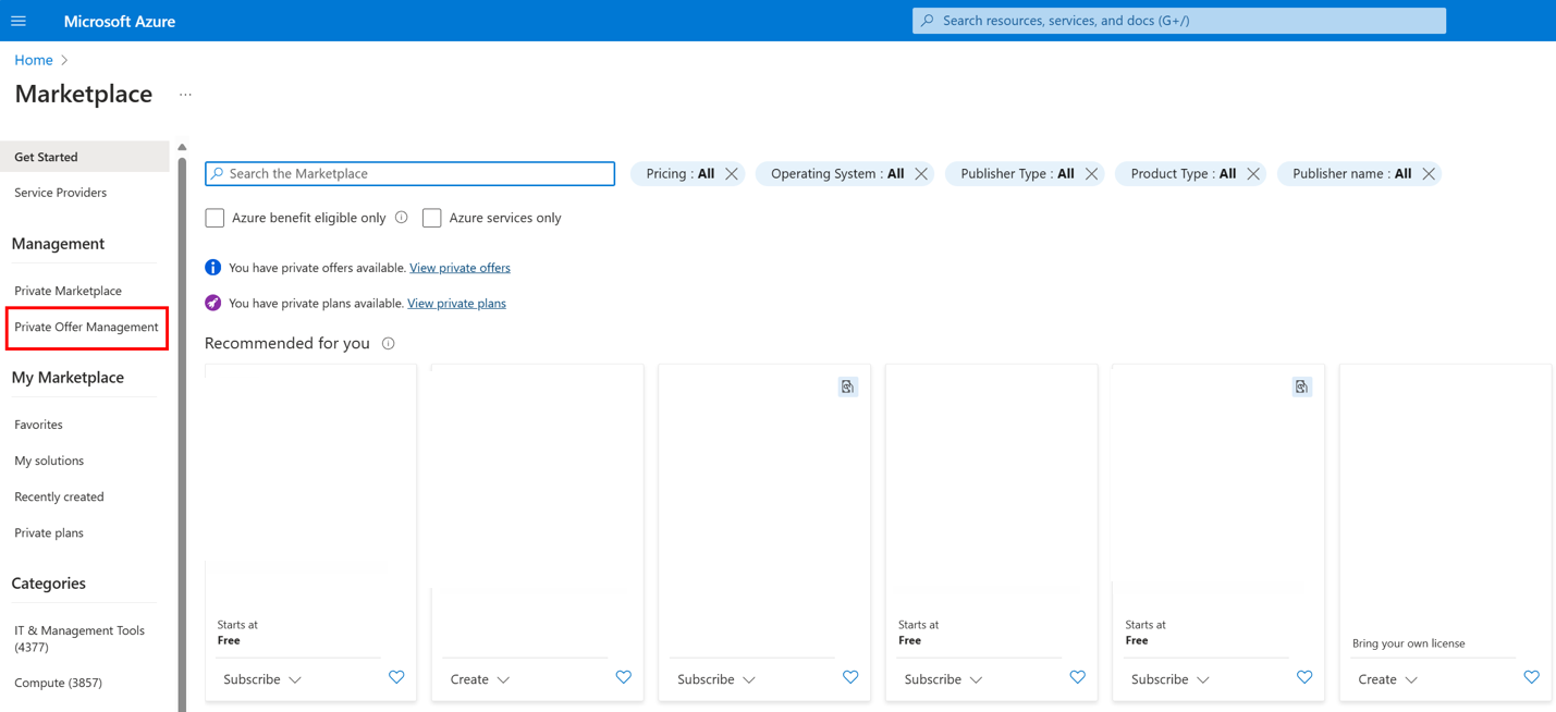 接受之後,您就可以繼續在 Azure 入口網站中購買或訂閱優惠方案。 系統會將您重新導向至 Azure 入口網站中的 私人優惠管理 儀錶板,以便完成購買。
