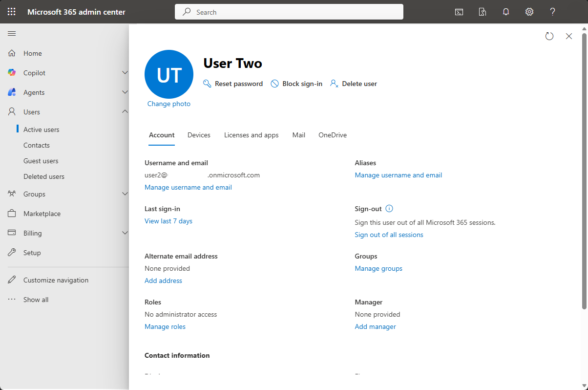 選擇你想刪除的使用者來開啟他們的帳號資料。 以下截圖顯示了一個名為「User Two」的虛構用戶帳號的詳細資料: