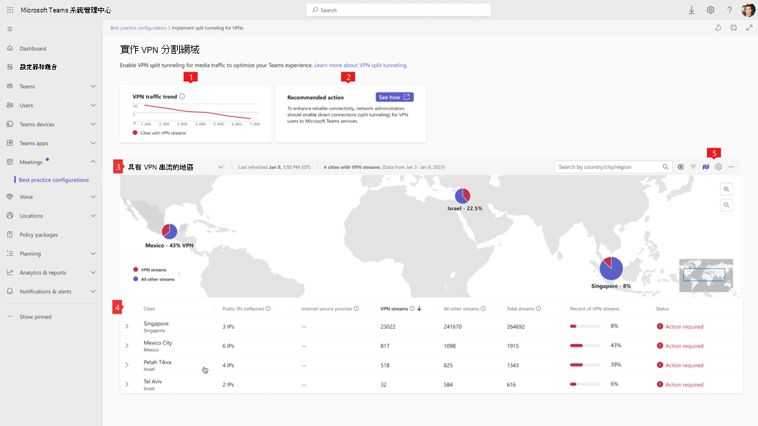 此儀錶板會醒目提示具有高比例串流連線到虛擬專用網 (VPN) 但不需分割網關的位置。 若要使用可靠的 Teams 連線能力,您應該實作 VPN 使用者Microsoft Teams 服務的直接連線。 間接聯機會為媒體通訊帶來更多延遲,並降低用戶的媒體品質。 若要深入瞭解 VPN 分割通道,請參閱 實作 Microsoft 365 的 VPN 分割Microsoft道。