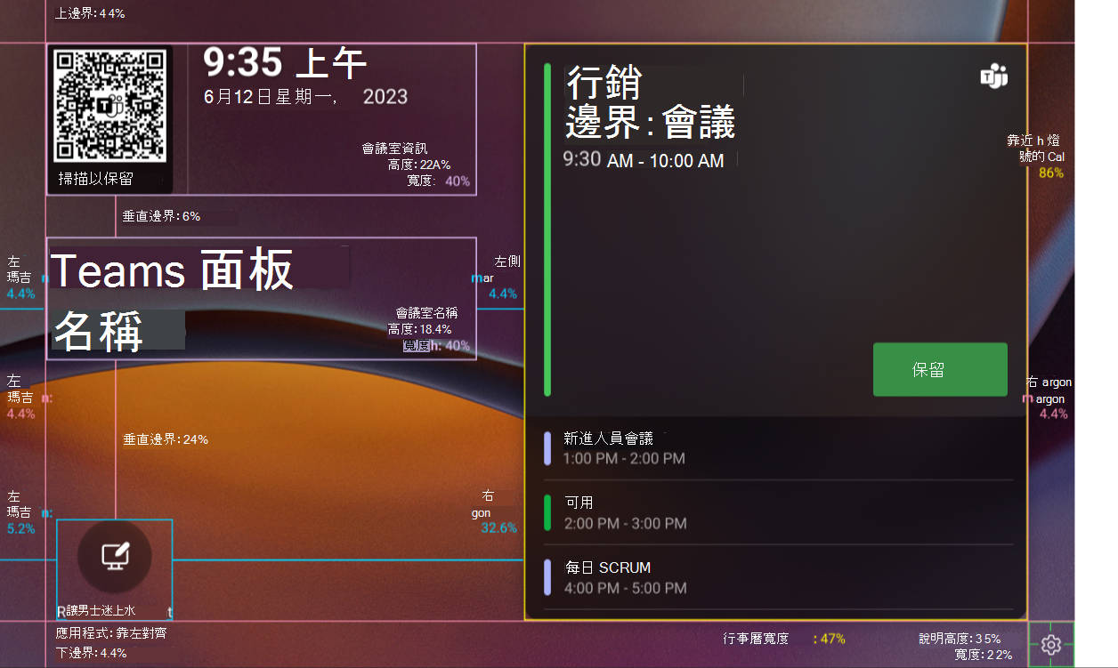在頂端角落使用深色背景,以確保使用者可以讀取白色文字中的時鐘和會議室資訊。