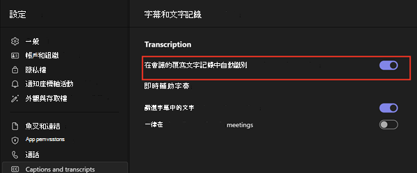 你可以選擇性地告訴使用者去驗證它是否已開啟,方法是在 Teams 應用程式的設定中,透過設定>字幕與逐字稿>自動識別我,並確保它已開啟。