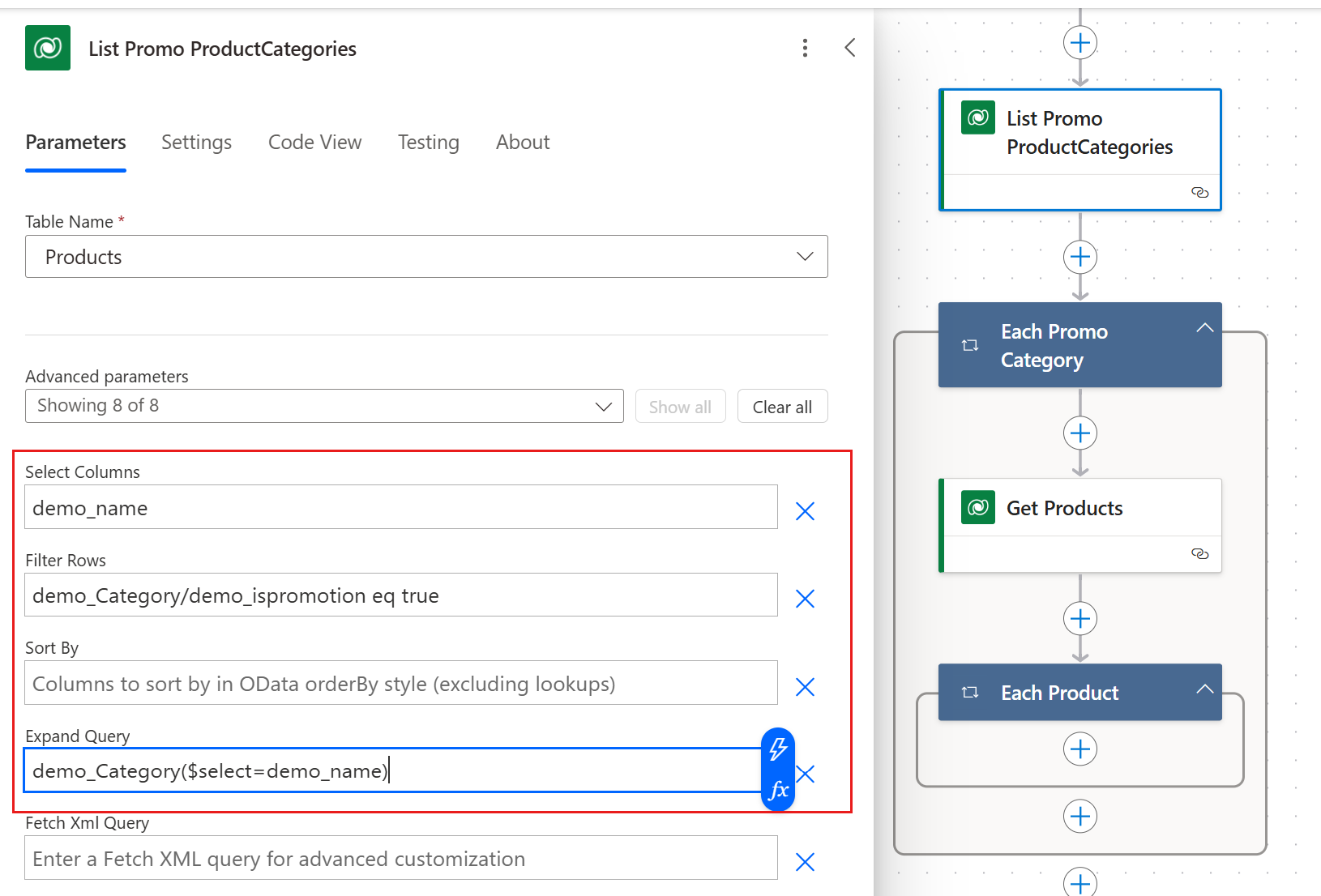 替代方法:使用 OData 查詢擴充功能來簡化此過程。 此方法可讓您使用單一 For each 迴圈,將對 Dataverse 的總請求數減少為僅一個 RetrieveMultiple 呼叫。