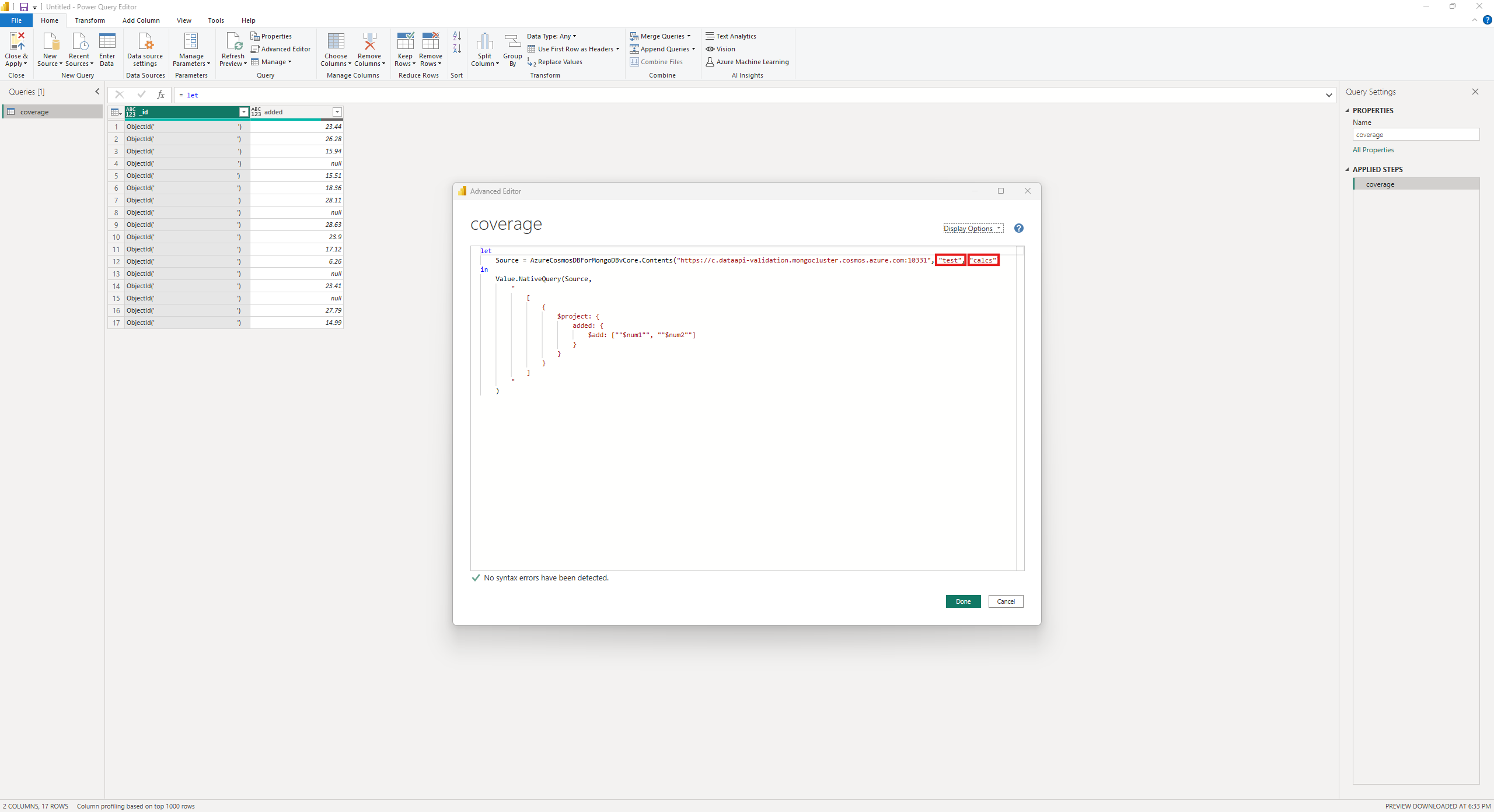 自定義 Value.NativeQuery 函式可讓原生 MongoDB 查詢傳送至數據源。 下列範例示範如何在一開始載入數據時,使用函式來建立數據表。 不過,您可以隨時叫用 轉換數據 選項的此函式。