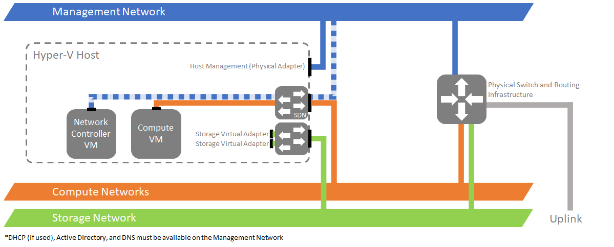 Windows Admin Center creates the configuration within the Hyper-V host. However, the management network must connect to the host physical adapters according to one of the following three options: