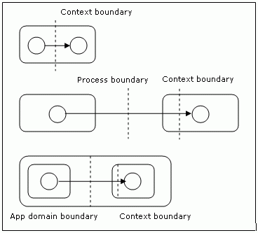 服務元件可以啟用並裝載各種組合。 如圖 3 所述,此討論將參考三個案例:同進程 (相同的應用程式域) 、跨應用程式網域 (相同的進程) 和跨進程啟用。 這些案例的重要性是呼叫元件時所跨越的界限。 同進程啟用會導致潛在的跨內容界限,跨應用程式域案例同時具有跨內容和跨應用程式域界限,而跨進程案例則會處理跨電腦/跨進程和跨內容界限。