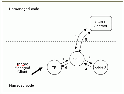 Serviced 元件的實作依賴 .NET 遠端處理,其提供可延伸的機制來插入以 Unmanaged 或 Managed 程式碼撰寫的服務。 Serviced 元件衍生自 CoNtextBoundObject 並實作各種介面,例如 IDisposable。 使用 ProxyAttribute 衍生的自訂屬性,即可輕鬆地自訂 CLR 中的啟用鏈結。 您可以藉由撰寫自訂的實際 Proxy 來自訂攔截。 需要新的 Serviced 元件衍生類別時,會自訂啟用鏈結,讓啟用呼叫實際呼叫 CoCreateInstance 的 Managed C++ 包裝函式。 這可讓 COM+ 根據先前註冊元件儲存在 COM+ 目錄中的資訊,設定 Unmanaged 內容和服務。 這也是實作延遲註冊的階段。 在元件註冊期間,InprocServer32 索引鍵會指向 mscoree.dll,因此將 COM+ CreateInstance 重新導向回執行時間,以建立實際的 Managed 物件。 因此,在啟用期間會建立自訂的實際 Proxy 物件。 此 Proxy 的同進程版本稱為服務元件 Proxy 或 SCP。 如圖 4 所示。