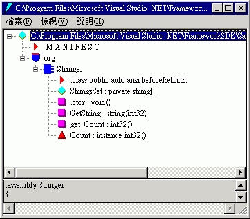 這個類別中有一個欄位 (StringsSet)、建構函式 (Stringer,和類別本身同名)、定義方法 (GetString) 以及屬性 (Count),加上編譯器自動建立的對應屬性存取子 (get_Count):