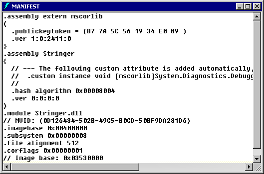 就像 Hello.exe,這個新的 Client.exe 中有它本身、.NET Framework 類別庫以及它使用的型別的資訊清單資訊。不過,它現在有的是 Stringer 元件和參考的包含型別 (這裡的 org.Stringer)。