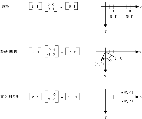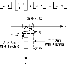 上圖所顯示的所有變換皆為線性變換。其他特定變換是非線性的,例如轉換,而且無法乘以 2×2 矩陣來表示。假設您想要以點 (2, 1) 作為開始、將它旋轉 90 度、在 X 方向轉換 3 個單位和在 Y 方向轉換 4 個單位。您可以使用矩陣加法之後的矩陣乘法來完成這項作業。