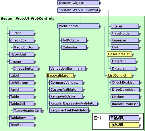 下列圖表展示 System.Web.UI.WebControls 命名空間中控制項的階層架構。這個命名空間中的控制項被稱為 Web 伺服器控制項。