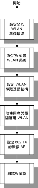 本圖顯示以 802.1X 實作 WLAN 安全性的程序,如本章所述。