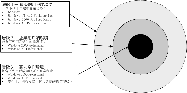 企業用戶端 — 提供專為新系統環境設計的強固安全性。這個商業環境包含使用 Windows 2000 Professional 和 Windows XP Professional 的用戶端。從舊環境移到企業環境所需的大多數工作牽涉到傳統用戶端的升級,例如從 Windows 98 和 Windows NT 4.0 Workstation 升級到 Windows 2000 或 Windows XP。這個環境內的網域控制站都是 Windows 2000 Server 或更新版,。而成員伺服器則是 Windows 2000 Server 或更新版。