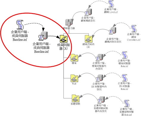 下圖說明 .inf 檔安全性範本如何作為企業用戶端 – 成員伺服器基準線原則 (MSBP) 的基礎。該圖也說明連結這個原則的可能辦法,能運用到組織的所有伺服器。