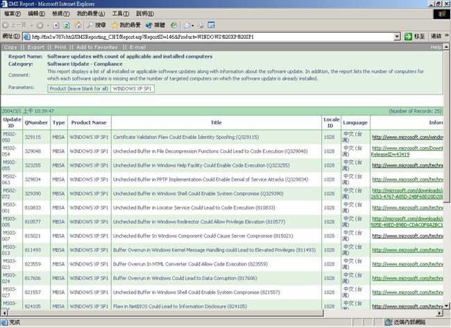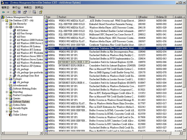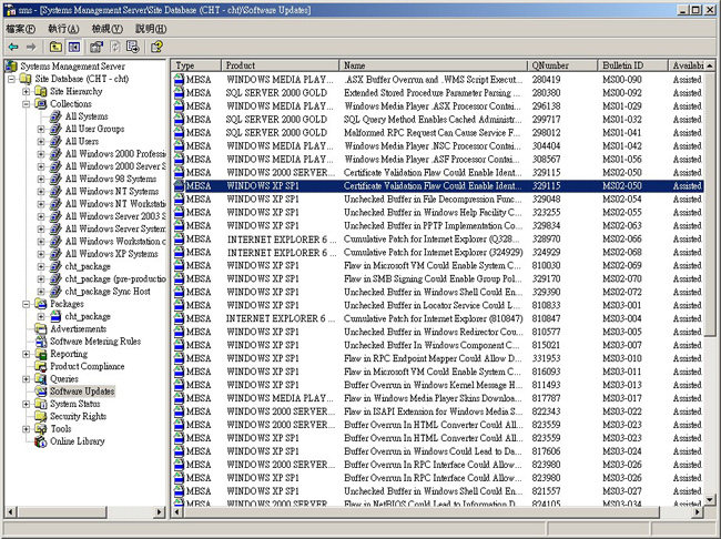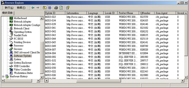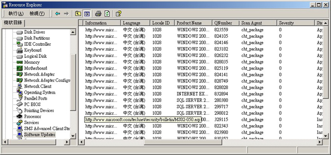 管理員可以使用 SMS 2003 之 Software Update Management 功能所提供的 Security Updates Inventory Tool 來延伸 SMS 硬體清單,以報告需要在一組用戶端安裝的軟體更新,如圖 1 所示。