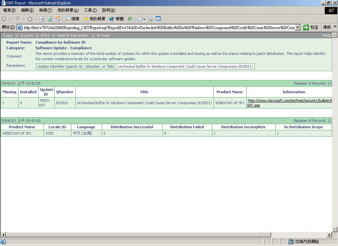 指定日數內,特定電腦的軟體更新狀態訊息 此報告提供讀者實際的安裝狀態。此報告若未說明軟體更新無法安裝的原因時,您必須檢查實際的電腦詳細資訊,了解通知狀態。