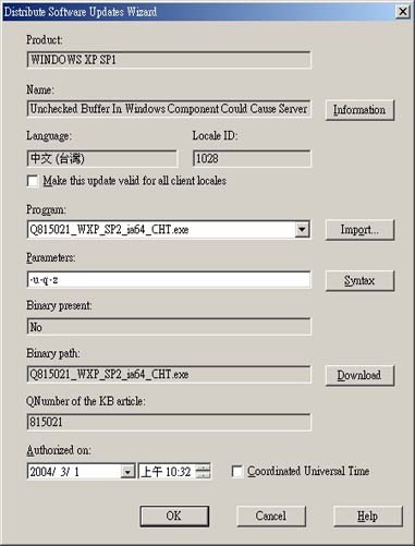 為了方便使用,請以新軟體更新的相關特定佈告 ID 或 KB 編號來命名此新程式,例如 "Non-expedited MS03039"。