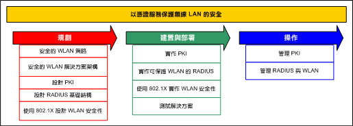 「保護無線區域網路的安全」解決方案有四個主要部分:《規劃指南》、《建置指南》、《作業指南》和《測試指南》。另外還有一個《遞送指南》,以附錄形式提供。除了這些文件外另隨附一組工具,其中包括專案計畫範例、自動化實作與作業工作的指令碼檔案,以及一組詳細的測試案例。當您在自己的環境中建置解決方案後,可使用這些測試案例來確認解決方案的功效。