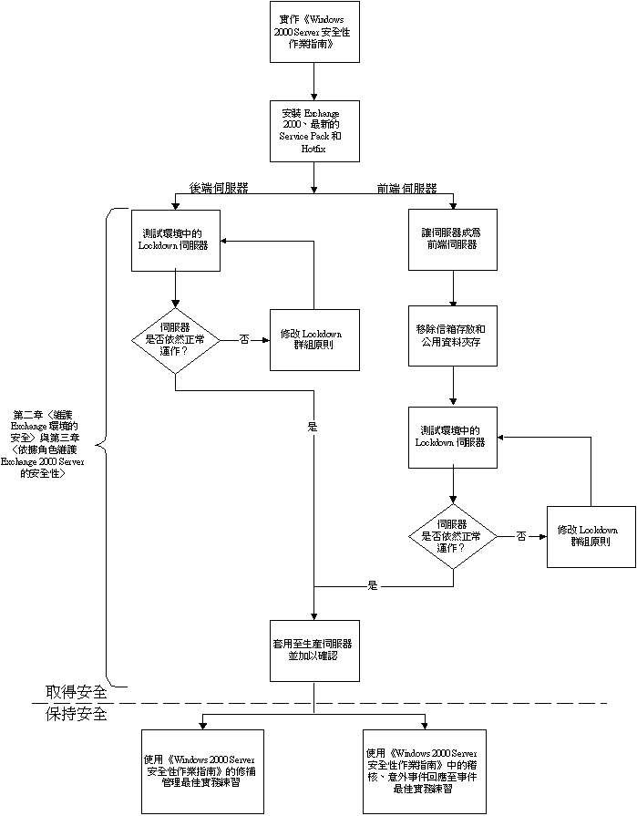 這個圖表顯示了保障伺服器安全 (取得安全) 以及維持這種情形 (保持安全) 所需的步驟,其中也顯示本指南與《Microsoft Windows 2000 Server 安全性作業》的章節內容如何協助您達到這些目標。