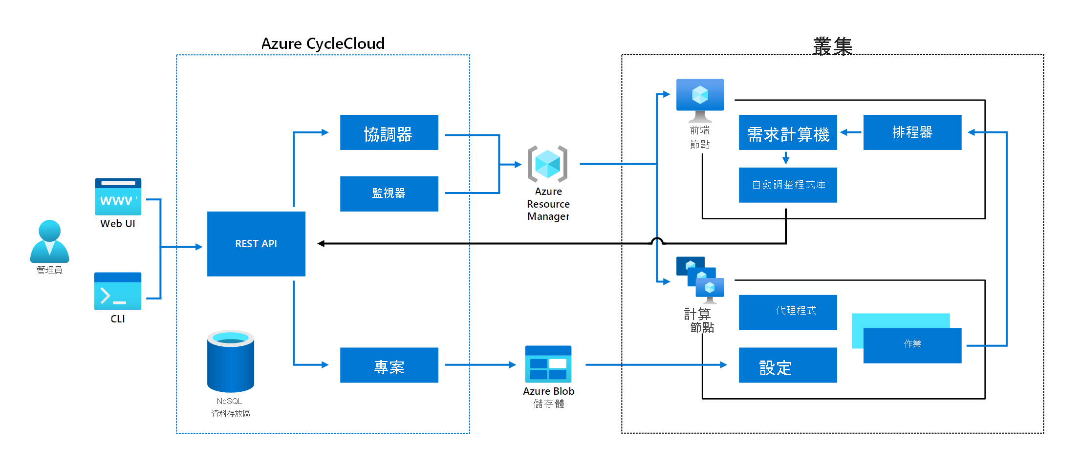 相較於 Azure Resource Manager,Azure CycleCloud 提供了一層額外的抽象概念,可將使用者直接處理 Azure 計算與儲存體資源的需求降到最低。 其角色是將可透過其圖形化介面或 CLI 存取的排程器層級設定轉換為 Azure Resource Manager (ARM) API 呼叫,以在使用者定義的虛擬網路和子網路中與 Azure VM 和 Azure VM 擴展集互動。 這些呼叫也會考慮區域 vCPU 配額、叢集大小限制,以及 InfiniBand 網路拓撲的限制式。 其也會使用這類建構作為鄰近放置群組,或將叢集節點連線至相同的 InfiniBand 交換器,以便將叢集效能最佳化。
