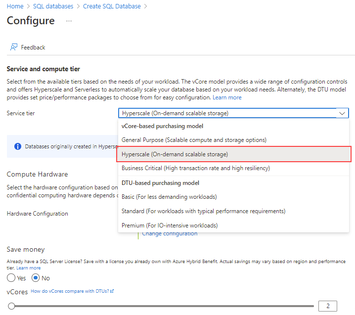 超大型服務層是基於虛擬核心的購買模型的一部分,是最新且具最高可擴展性的選項,顯著超越一般用途和業務關鍵層的限制。