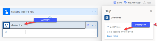 The Summary field is important because it shows up in the list of actions and triggers when you're selecting the one to use. We recommend that you're descriptive enough so that you can tell what the action or trigger does. For example, the GetInvoice action description could be Get a specific invoice by ID. Frequently, makers will find the action by searching, so having descriptive names can help them find the right action quickly.