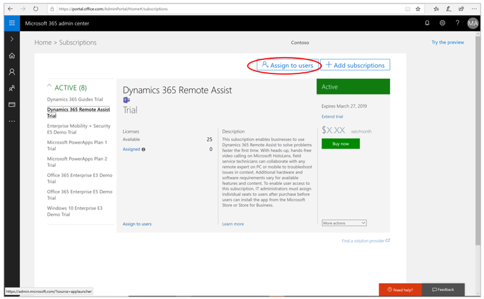 Users who have administrative access to the tenant in which Dynamics 365 is deployed can assign the necessary licenses to technicians and remote collaborators through the Microsoft Admin Portal.