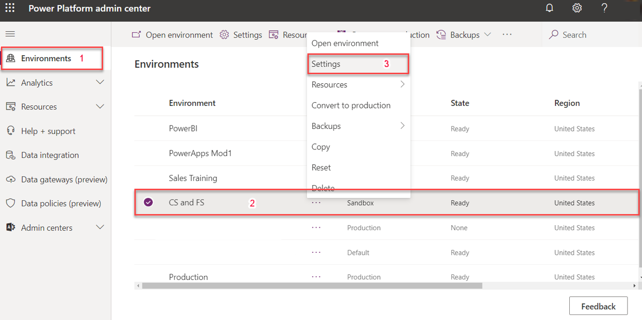 Under the Environments section, select the environment that Field Service is installed in and then select Settings.