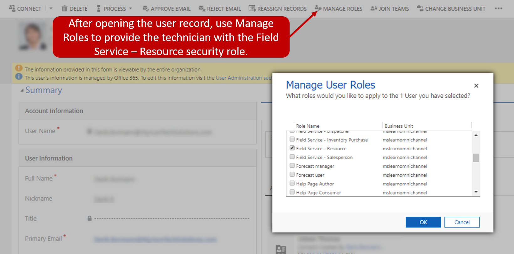 For each user defined as an onsite technician (frontline worker), you need to give them the Field Service – Resource security role by selecting Manage Roles on the user record. This security role ensures that the technician can access the necessary data and perform the necessary actions on records while they're working in the field.
