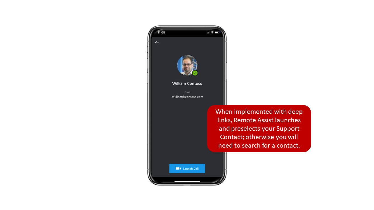 When the technician launches Remote Assist directly from Field Service Mobile by using a deep link, Remote Assist will launch automatically and the person who was identified as the support contact on the Field Service work order will be auto-selected in the application. If Remote Assist could not be launched directly, the technician is taken to the standard screen where they can search for the subject matter expert whom they want to work with.