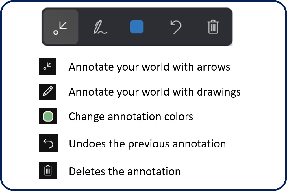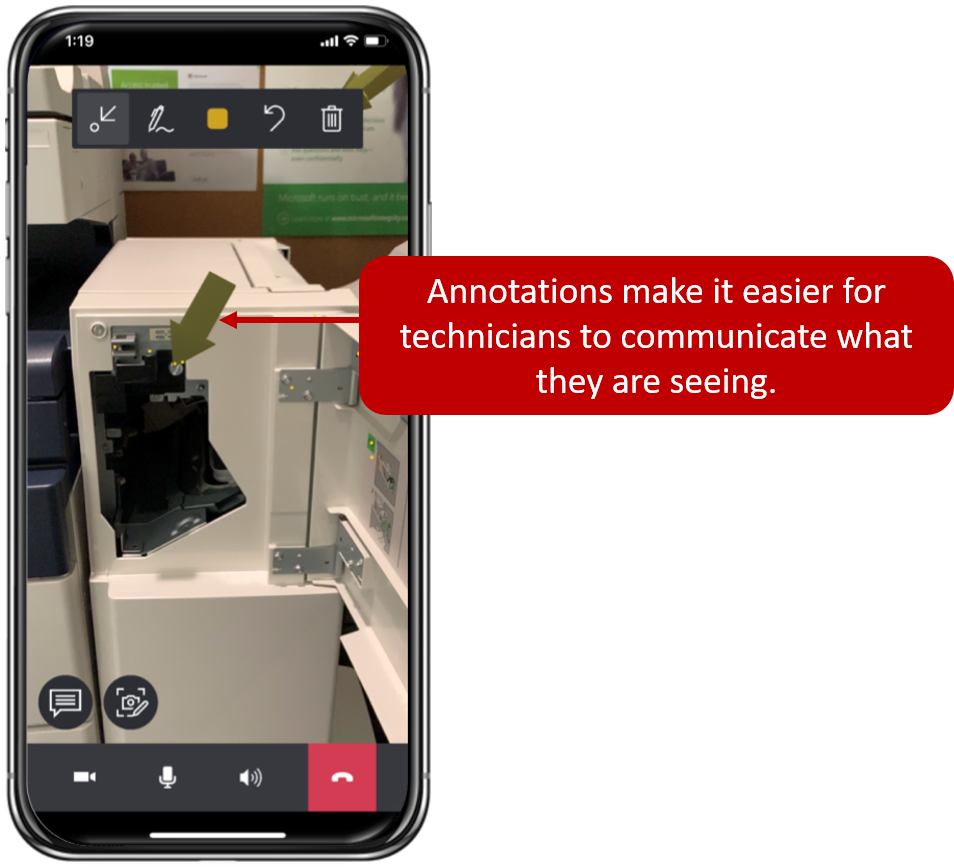While working with Remote Assist, technicians can use all the typical features that their application provides. One key feature is annotations. Annotations allow technicians and remote collaborators to visually call out an environmental area or asset to examine or manipulate. As technicians are displaying the environment through their rear-facing camera, the technician and remote collaborator can add annotations to what they're looking at and can share with each other during a video call. While in a call, the annotation toolbar allows technicians to place arrows and drawings into their environment.