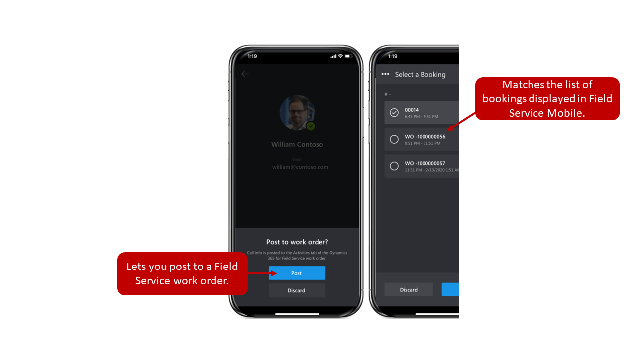 When the technician has gained the necessary guidance from the remote collaborator, they can end the call. The technician will be asked if they want to post the call as an activity to the work order timeline. They will open a list of available bookings that the call can be posted to. The list of provided information will match the bookings that are presented in the Agenda view from the Field Service Mobile app.