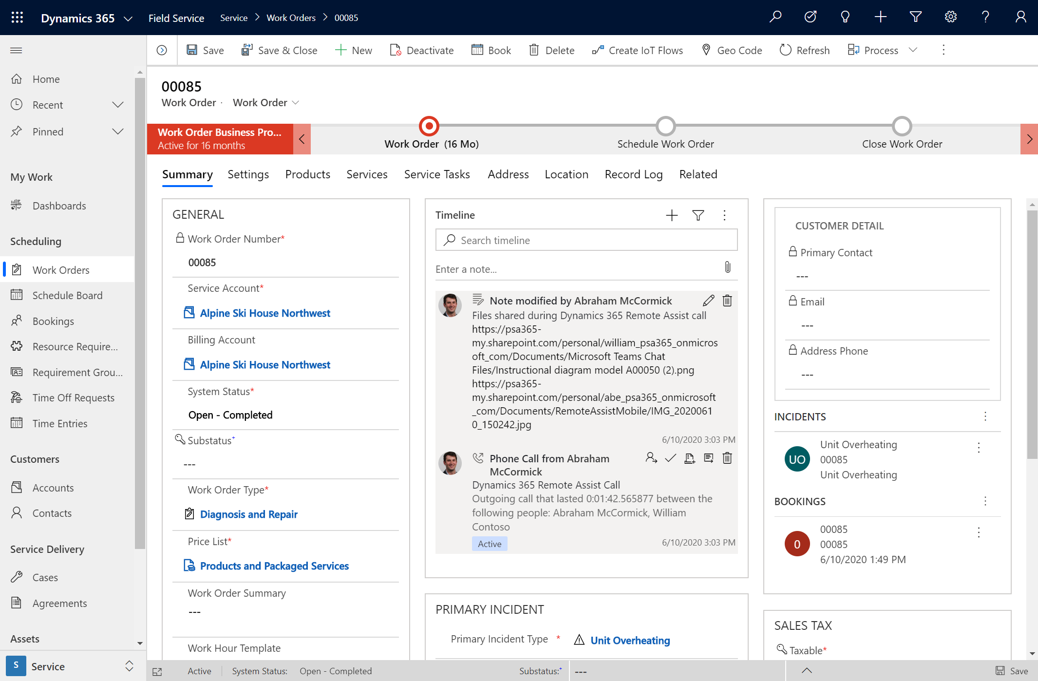 After a Remote Assist call is complete, the call can be documented on the timeline of the work order that the call originated from. In Dynamics 365, the activity timeline is used to keep track of all communications with a customer or contact as it relates to the record. For example, the activities might include emails, phone calls, or notes that are related to a work order record.