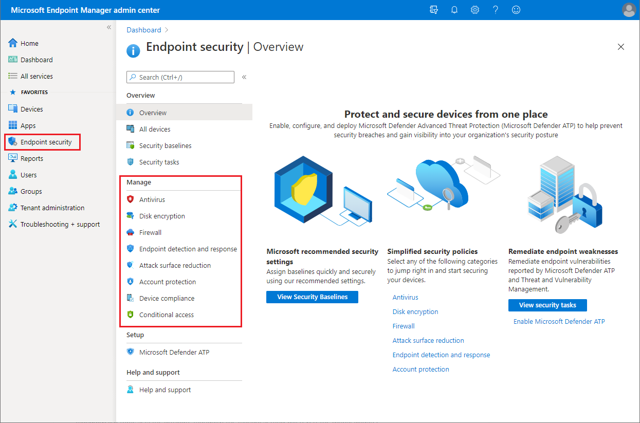 - 透過專門聚焦的政策管理裝置上的安全性設定:每個端點安全策略都著重於裝置安全性的各個層面,例如防毒、磁碟加密、防火牆,以及透過與 Microsoft Defender for Endpoint 整合提供的數個區域。