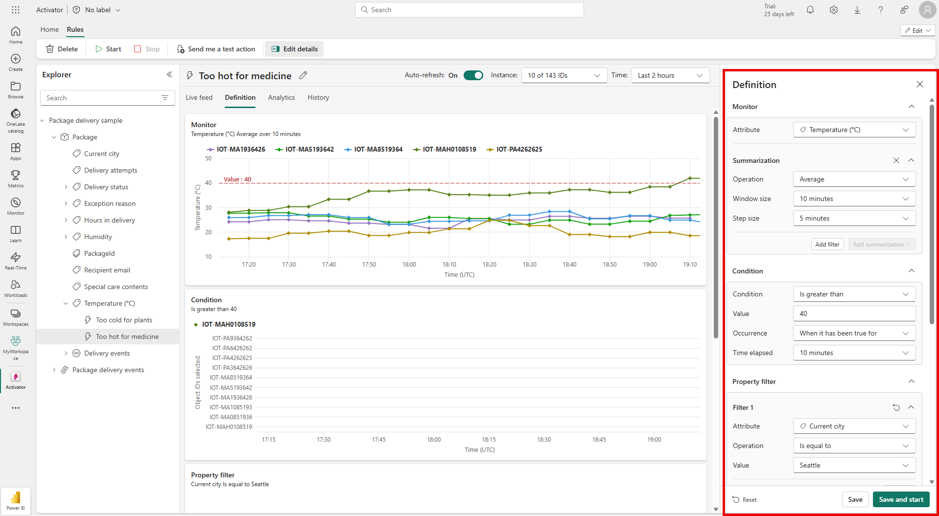 讓我們逐步解說如何建立此案例的規則。 當您在 Activator 介面中建立規則時,會開啟 定義 窗格,其中包含數個要設定的區段。 我們現在將著重於 「定義」 窗格中的前三個區段 - 監視器、條件和屬性篩選器,並在下一個單元中涵蓋動作。