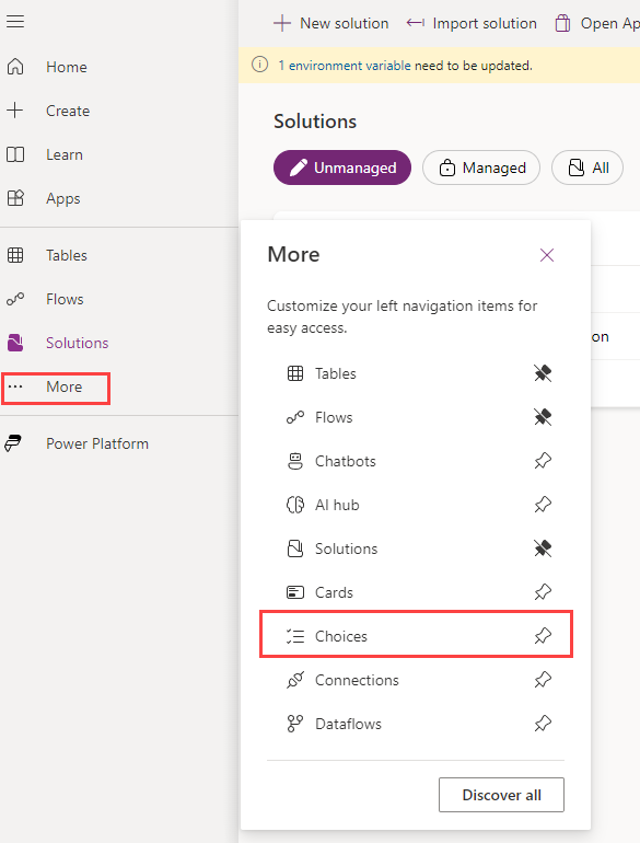 You might want to make a new custom choice to use across many entities in Microsoft Dataverse. You can create a choice in two ways: by creating a choice when you define a new field within a table, or by creating a choice using the choice functionality within the Power Apps portal.