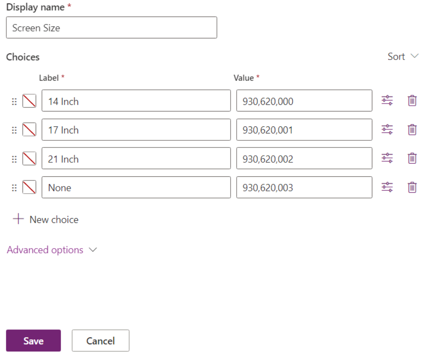 Enter 14 Inch, 17 Inch, 21 Inch, and None in the items.