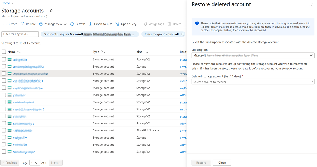 如需詳細資訊,請參閱從 Azure 入口網站 復原已刪除的記憶體帳戶。