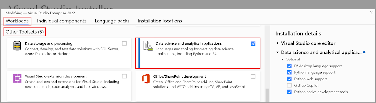 資料科學和分析應用程式工作負載可在 Visual Studio 安裝程式的 [ 工作負載>其他工具組] 下取得: