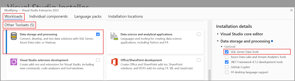 若要充分利用 SQL Server 整合,請使用 Visual Studio 安裝程式來安裝 工作負載>其他工具組>數據儲存和處理 工作負載。 選取 [ SQL Server Data Tools] 選項以啟用 SQL IntelliSense、語法醒目提示和部署: