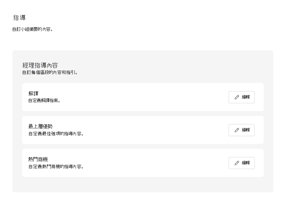 若要編輯 [ 解譯]、[ 最佳優點] 和 [ 熱門商機 ] 指引的默認內容: