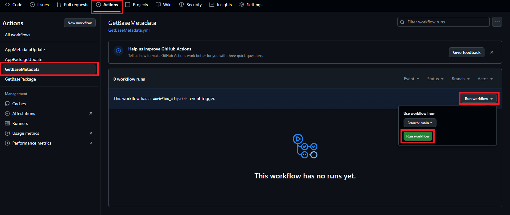 從 GitHub 存放庫中的 [動作] 索引標籤執行此工作流程。 選取相關工作流程,然後按一下 執行工作流程。