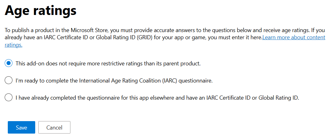 若要在 Microsoft Store 中發佈產品,您必須提供年齡分級問題的準確答案,並接收年齡分級。