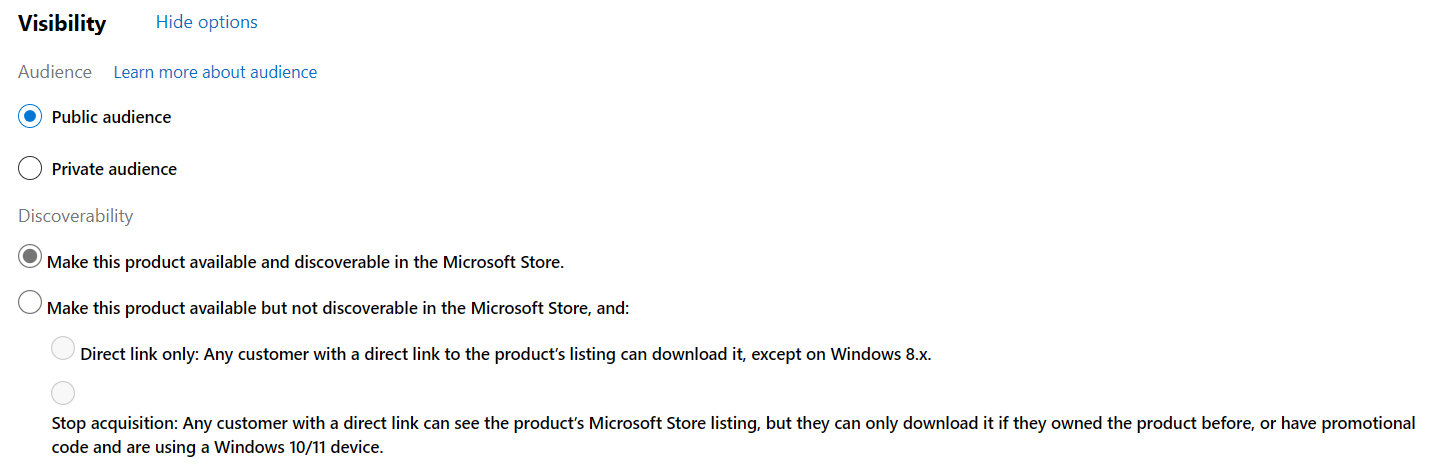 預設情況下,您的應用程式 Store 清單會顯示給公開受眾。 這適用於大部分的提交,除非您想要將誰可以看到您的應用程式清單限制為特定人員。 如果您想要的話,您也可以使用 [可探索性] 區段中的選項來限制可探索性。