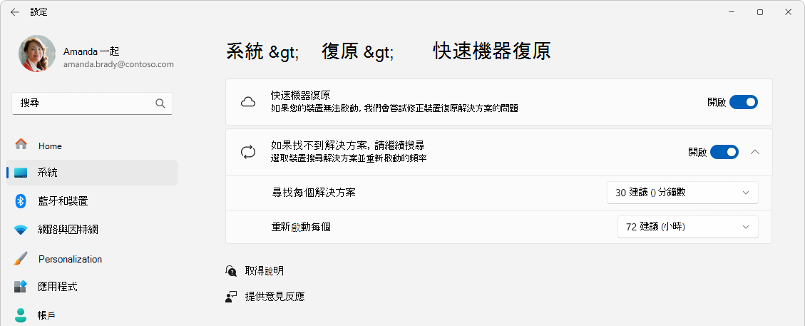- 啟用後,裝置會自動連接到 Windows Update,並嘗試尋找修復方法。 若第一次嘗試未找到解決方案,使用者會預設被引導至其他復原選項,或設定裝置自動重試,無需手動介入