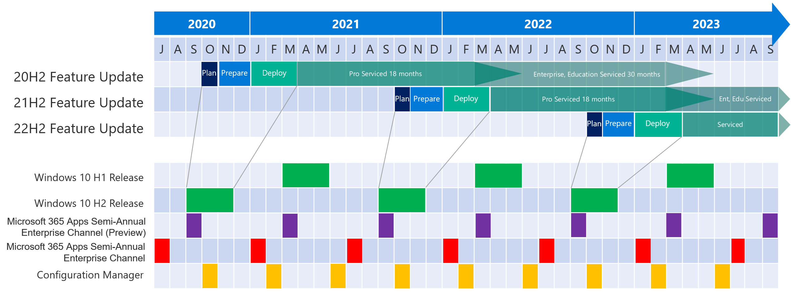 您可以使用行事歷方法來加快每年兩次的頻率或每年的步調。 視公司大小而定,每年安裝功能更新的頻率低於一次,會使裝置失去服務並容易遭受安全性威脅的風險,因為一旦版本無法支援,它們就會停止接收每月安全性更新。